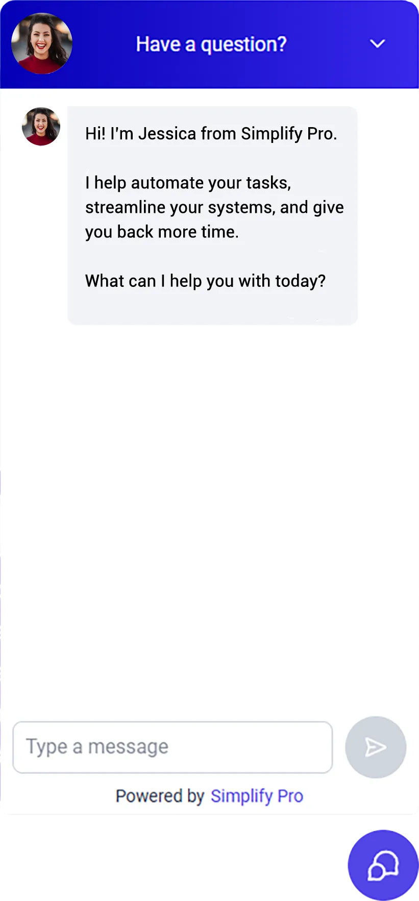 Simplify Pro’s AI Chat Assistant replies instantly on Live Chat, SMS & Social Media - capturing leads, answering questions, and booking appointments so you can focus on growing your business - not chasing DMs.